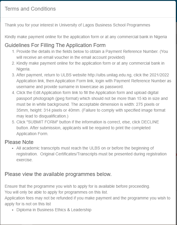 If you are application for UNILAG Business school, you will need to take note of the following information on the screenshot: